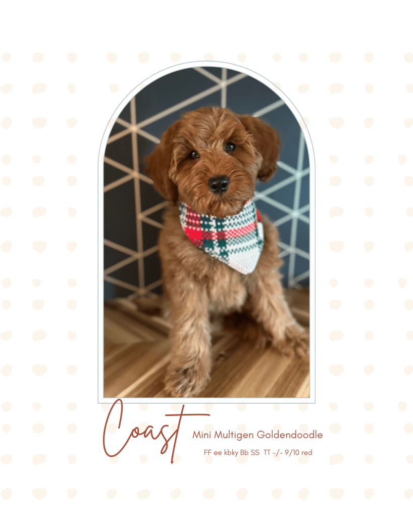 Coast is our sweet and charming upcoming Mini Multigen Goldendoodle, expected to weigh 15-20lbs. He has the most adorable Teddy Bear face and loves to be cuddled and give kisses. This handsome boy will be a future stud for us and will be paired to make intense reds and beautiful tuxedo and red abstract pups. He also carries for the liver nose gene so some of his pups will have the desirable green eyes and brown noses. He has a straight, soft, silky non shedding coat making grooming maintenance easy. He is quite a hunk and a real life teddy! His pups will be gorgeous!