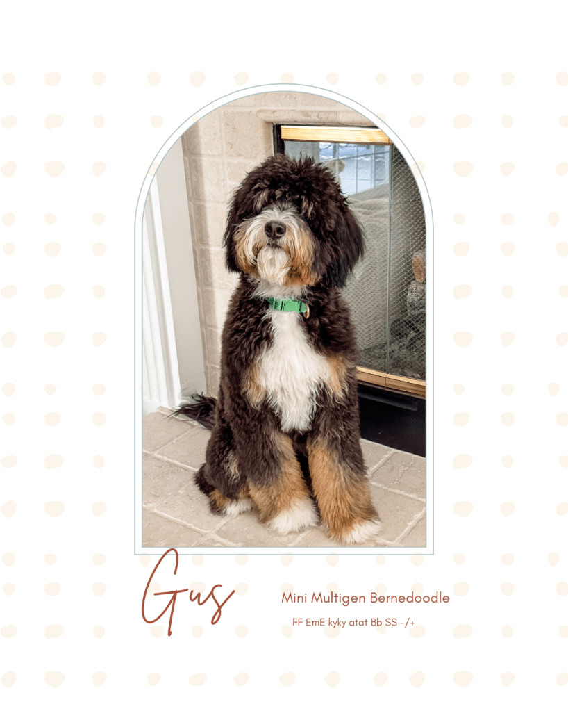 Gus is our very own Winnie & Alfie pup that we raised and held back from their first Bernedoodle litter together. He is gentle, calm, and adapts easily to any new environment. He loves going on school pick ups and getting all the belly rubs from the kids. He just wants to be loved on by everyone, and loves his snuggles. He is usually a personal foot warmer and will sit right on top of your feet. It’s a known Bernedoodle trait that they must be touching or leaning on their humans to show their love and adoration. He also carries for brown so he can pass on the desirable chocolate color to his puppies. Gus is 35lbs. of teddy bear, has incredible genetics, and a personality that is unmatched! He is quite a guy!