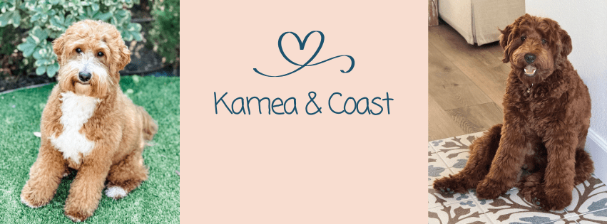 Kamea & Coast are both adorable mini multigenerational Goldendoodles. Their pups will be around 20-30lbs. Kamea is one of our very own pups that we held back from our calm and gentle goldendoodle stud, Archie! She is super mellow, human focused, and loving, and Coast is as sweet as can be and loves to cuddle, he is a real life teddy bear. Together, this litter will be spectacular and have wonderful temperaments. Coats will be a variety of soft Straight/ Wavy, with the least amount of shed for allergy sufferers. Pups will be deep intense red, tuxedo and some red abstract (with white markings) and some caramels (green eyes and brown noses).
